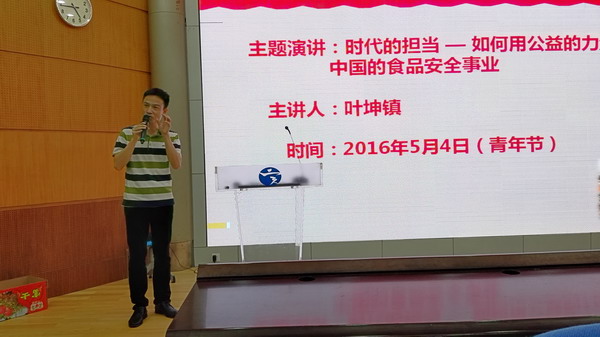 5月4日,正值“五四”青年节,叶坤镇校友在高中部阶梯教室以“时代的担当——如何用公益的力量推动中国的食品安全事业”为主题,为学弟学妹们带来了一场充满正能量的讲座。