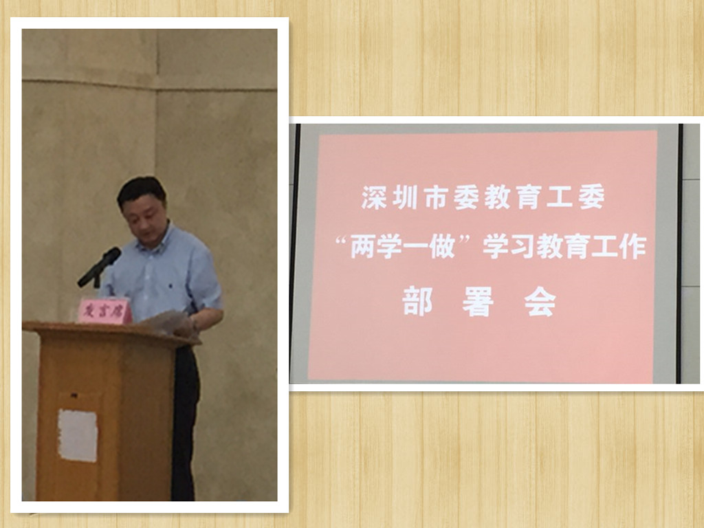 2016年5月24日下午,深圳市委教育工委在第一职业技术学校阶梯教室召开“两学一做”学习教育工作部署会议,市委教育工委书记、副书记、委员,各高校党委书记、分管副书记、组织部部长或党办主任、联络员,市机关全体党员干部;市教育局直属单位(学校)党组织书记、副书记、党办负责人、联络员等参加会议。市委教育工委范志刚副书记主持会议,市委教育工委书记郭雨局长在会上对教育系统各级党组织开展”两学一做”学习教育工作进行了部署,深圳大学、南方科技大学 、深圳职业技术学院、深圳信息职业技术学院、深圳中学、深圳第二实验学校等6个单位的党组织组织人先后介绍了本单位开展“两学一做”学习教育工作进展情况、主要做法和特点及下一步工作打算与建议。