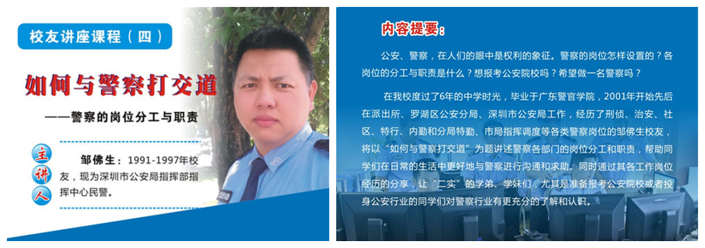 5月25日下午,校友课程第5讲《如何与警察打交道》在综合楼一楼阶梯教室开讲。主讲嘉宾邹佛生校友走进教室时让此前认识他的师生吃了一惊:你不是学校聘请的国际跳棋的社团指导指导老师吗?怎么成警察了?原来,我们熟悉的这位国际跳棋高手,也是一位从警15年、现供职于深圳市公安局指挥中心的公安干警,这个意想不到的开始令同学们对这位多才多艺的大师兄钦佩起来。