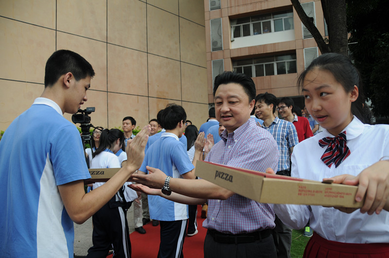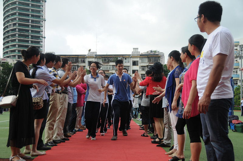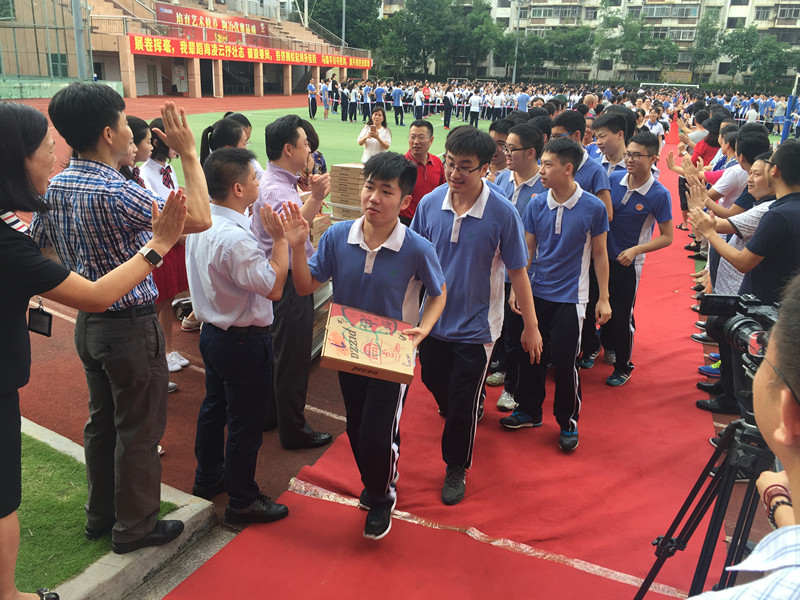 “十年寒窗苦,今朝凌云志”。 即将奔赴战场的高三勇士斗志昂扬、热情洋溢地列队走过红地毯,全校教职员工夹道迎接,无数只手组成的加油阵队气势磅礴,无数击掌声此起彼伏,给同学们鼓足了战斗的勇气。校长向出征的勇士们赠送的“必胜饼”是今年加油、助威的新增环节,“必胜饼”是食堂的师傅们连夜赶制而成,而包装盒上的装饰则由美术科组老师率高一美术班学生加班绘制,象征胜利的“必胜饼”代表着全校师生的共同心声:高三加油,二实必胜!