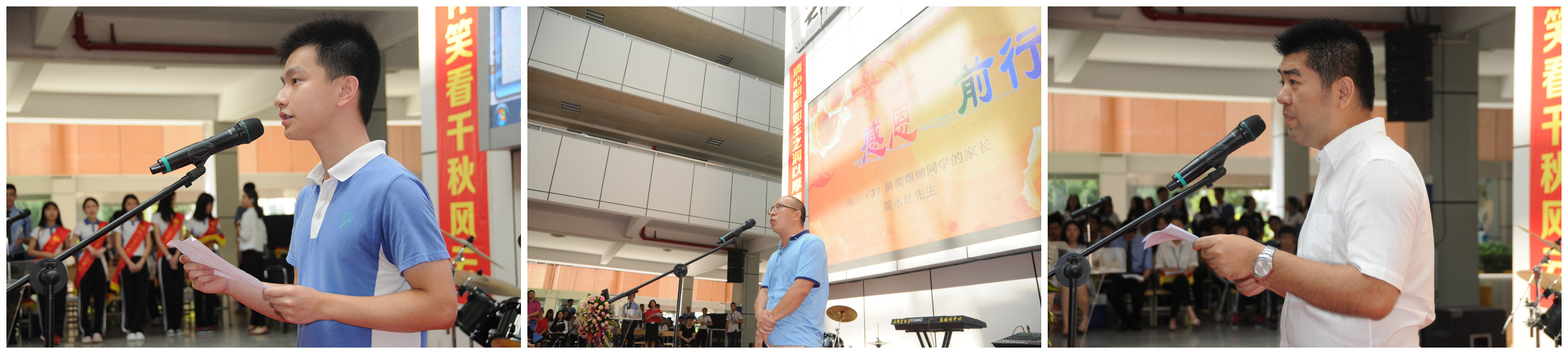 接下来优秀毕业生代表陈新栋、家长代表简永红、校友代表庄志云分别发言。他们畅谈了各自求学、工作等方面的经历,共同表达了对老师、父母的感激,对即将离开校园的学弟学妹们的鼓励、期待与祝福。