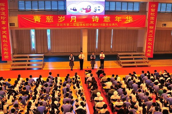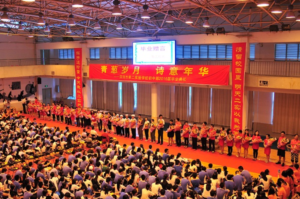 会场正中舞台上方悬挂着“青葱岁月 诗意年华——深圳市第二实验学校初中部2016届毕业典礼”的巨大横幅,两侧悬垂着“挥手道珍重今天我以二实为荣,情留校园里明天二实以我为傲”的对联,鲜艳的红地毯覆盖着整个舞台,会场布置隆重而又温馨,处处显示了学校和初三年级对这次毕业典礼的重视。
