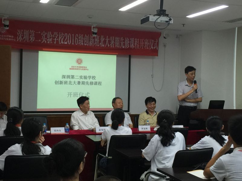 7月20日上午,深圳市第二实验学校2016级创新班北大暑期先修课程开班仪式在北京大学国际关系学院隆重举行,陶继智主任主持。北京大学教授、北大原副教务长吴宝科致辞,为同学们解密北京大学优秀学生成长足迹。郑向东副校长“为什么学习、如何学习、学习要持之以恒从而成就幸福人生”的讲话,让同学们印象深刻。华文尧同学作为60名创新班学生代表的发言,表达了对北大的向往,对未来学习的期待。全体同学慷慨激昂朗诵《少年强则国强》,令在场的每一个人感受到了爱国情怀之深沉,少年志向之远大。物理。开营仪式在北大附中原校长赵钰琳教授的精彩发言中落下帷幕。