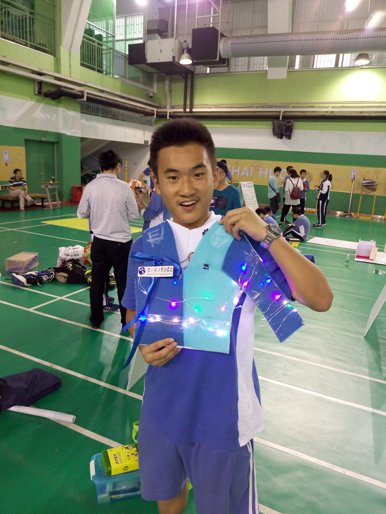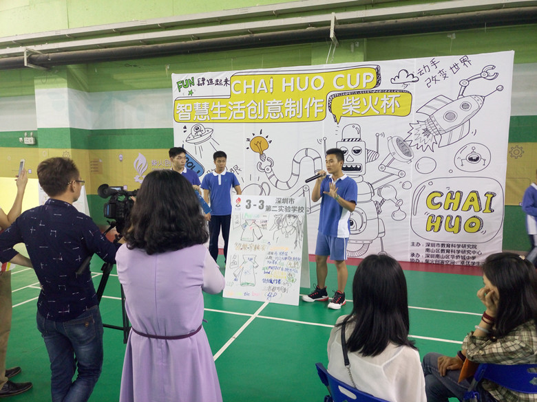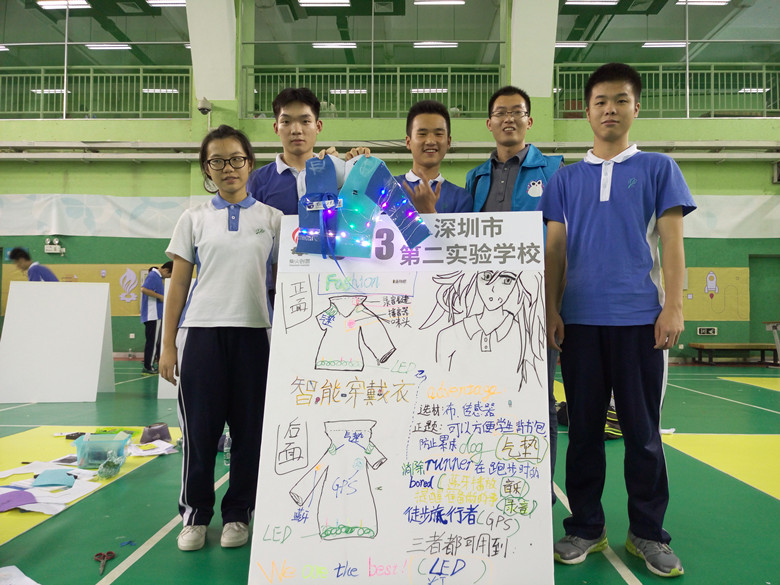 深圳市中学生“创客先锋、实践展能”暨“柴火杯”创客比赛由深圳市教育科院研究院主办,南山区教育科学研究中心、华侨城中学、柴火创客空间、卓优网联合承办。来自全市各中学的40支优秀队伍参加了本届比赛。比赛要求各校代表队在2.5小时内利用给定“材料包”,在规定的时间里进行高度个性化的创意设计和制造,创造出能改善生活质量或能带给人们快乐的作品,然后由六位评委选出优胜的20支队伍进行3分钟的现场路演。我校由高一年级黄栩芫、周晓霖、何旭湘、陈濮龙组成的的代表队不畏各校强手,沉着迎战,反应机智,在阅读比赛的任务及流程后,迅速确定选择智能穿戴衣进行创意制作。该智能衣利用光控传感、声控传感器外加压力传感器设计成保护气垫消除运动中的疲劳,同时具有蓝牙播放功能,当行走到光线较暗的地段时LED灯会自动点亮进行环境照明与路况提醒,四位同学现场裁剪设计并合作完成了加工制作。
