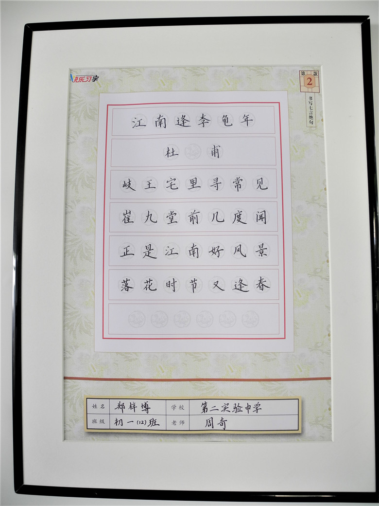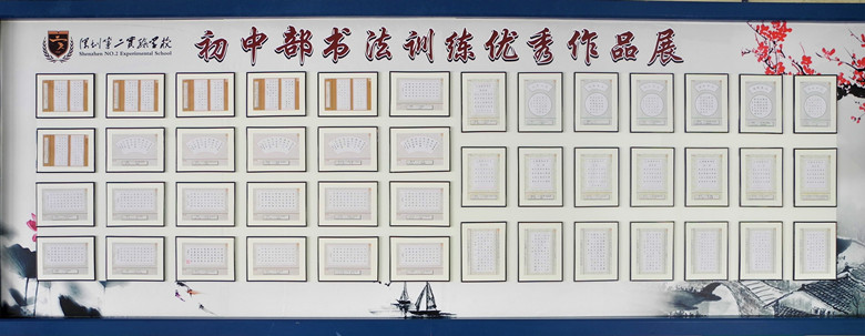 本次作品展从午间训练到作品征集、评比、装裱至最后展板落成,历时2个月,呈现出以下四个特点:1.全员参与。我校初中部全体学生近一千七百人共同参与,体现了学校“促进每一个学生的最优成长”的教育理念,同时也对每个年级及班级的书法水平进行了整体性的评估,以便下个学期更好地设计与规划全校的书法训练课程。2. 过程专业。比赛用纸、获奖奖状、作品装裱、公章印制、四块展板均由教学处斟酌配合,美术老师精心设计,以整体布局与字体结构为评判准则,对每个学生的书法作品精挑细选,评比公正客观。3.助力课堂。本次比赛的古诗文,均是以本年级语文教材《古诗诵读》为书写内容,旨在让学生不仅享受书法熏陶,更注重领会古诗文的内涵。4.作品优质。初中部展出的三个年级的获奖作品,笔画流畅,横平竖直,结构匀称,整体美观,示范性强,表现出了我校学子优秀的书法水平,得到了全校师生、家长与社会的一致好评!初三11班的谢乐天同学在本次活动中荣获了一等奖,他说,这是跟平日的用心揣摩与中午的书法训练紧密相关的,横画平云青山,竖为出鞘利剑,他会把书法练习坚持下去!