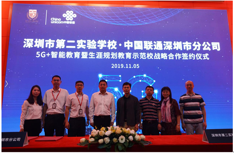 11月5日,深圳市第二实验学校与深圳联通关于“5G+智慧校园及职业生涯规划示范校”战略合作协议签订仪式在深圳联通大厦举行