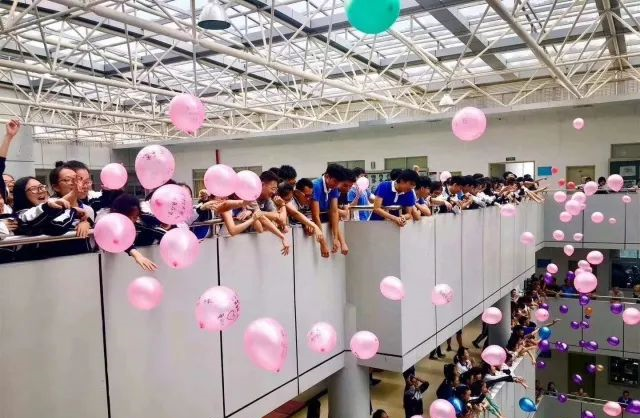 5月28日,二实教学楼满天飞舞着五彩斑斓的气球,响起气势震天的激情呐喊。原来,这是全校数千师生欢聚一起,写祝福,放气球,齐高歌……为高三学子加油助威。
