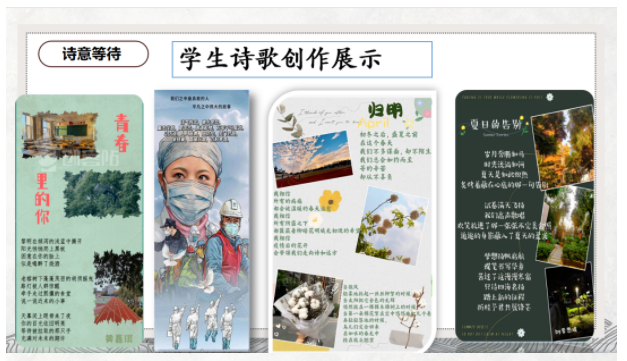 深圳市第二实验学校高二语文组彭月玲老师在教授诗歌单元时,在所教高二7、8班举行了为期一周的云端“为你写诗”仿写诗歌活动,或歌颂白衣天使,或抒写青春,或梳理情绪,或寻找自我,或挖掘思想,书写心中所感,探寻生命的意义。同学们将自己原创诗歌配图做成海报、配乐朗诵视频,在班会课上分享。班会课上,同学们不断刷屏,讨论区鲜花不断,惊喜不断。