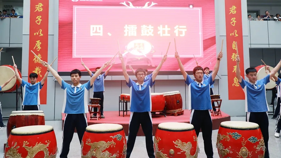 十三面大鼓错落而立,四方旌旗迎风招展。战鼓开始擂动,号角已经嘹亮。宝剑霜刃初试,雄鹰展翅翱翔。快慢错落、铿锵有力、气势磅礴的鼓声响彻二实校园,激情澎湃的场面令人士气大增,斗志昂扬。