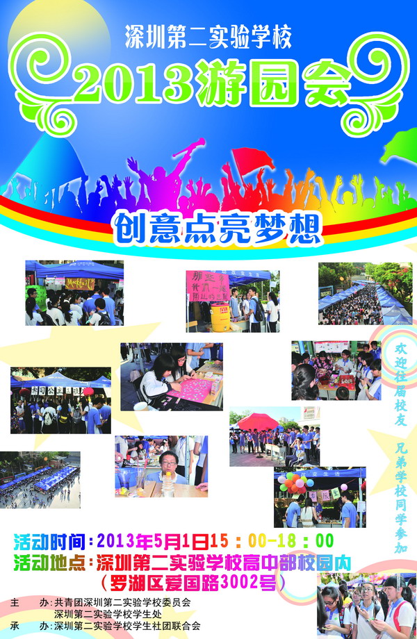 我校学生社团联合会于2013年5月1日下午3:00—6:00在学校高中部举办一年一度的校园社团游园会。本届社团游园会的形式,以趣味性、娱乐性、互动性的综合模式代替以往单一的社团文化展示模式,从而起到发展社团文化,弘扬创新精神的目的,游园会主题为:创意点亮梦想。