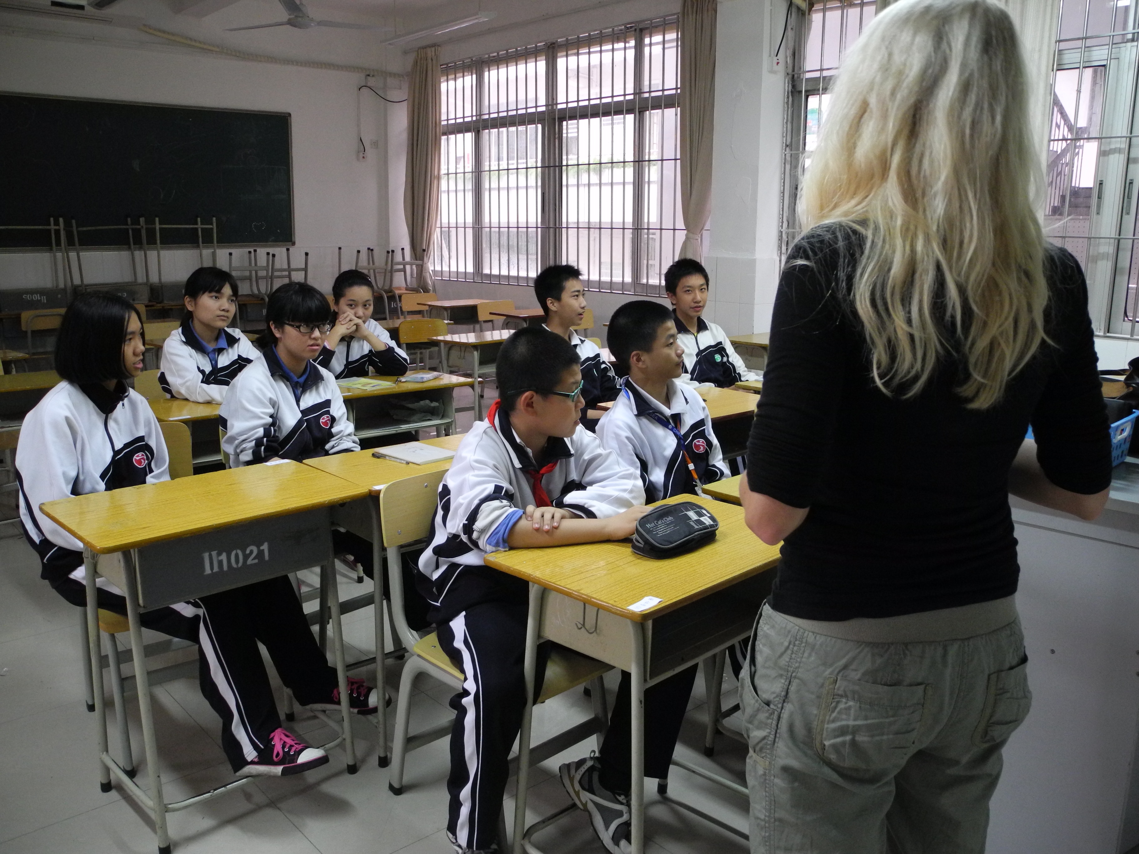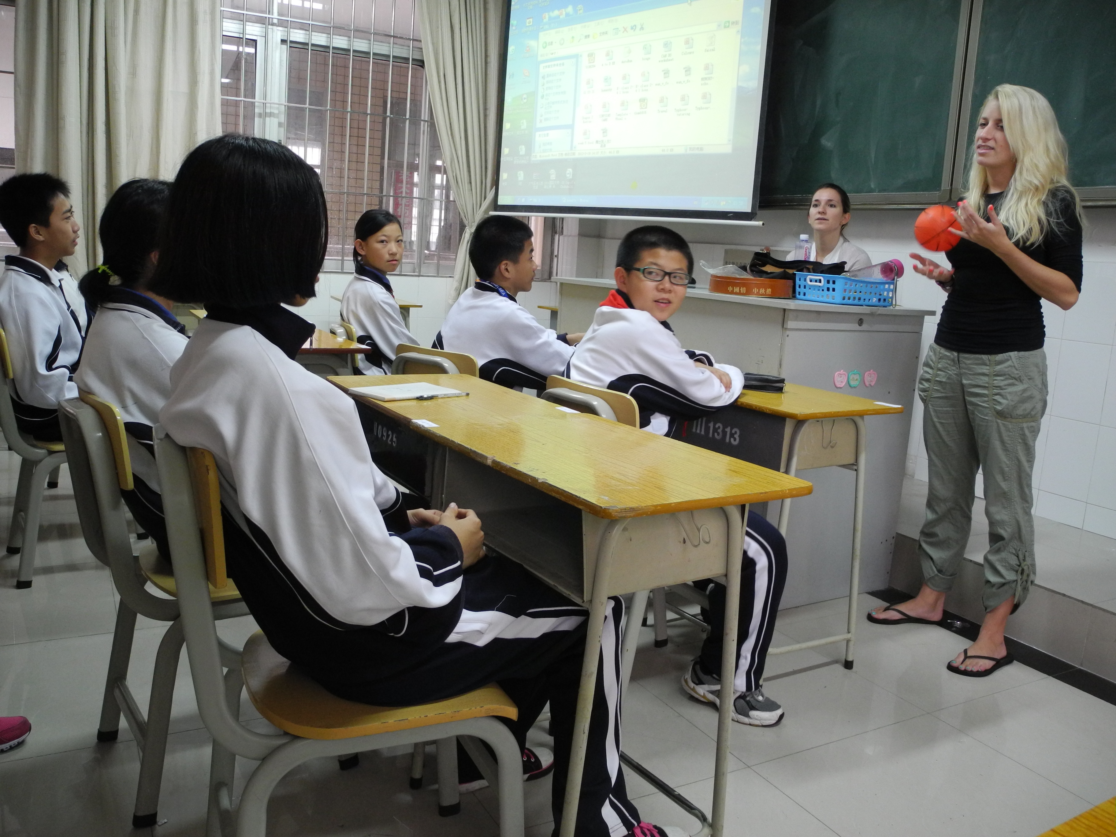 图为快乐英语角社团的同学们在社团课上与外教老师互动