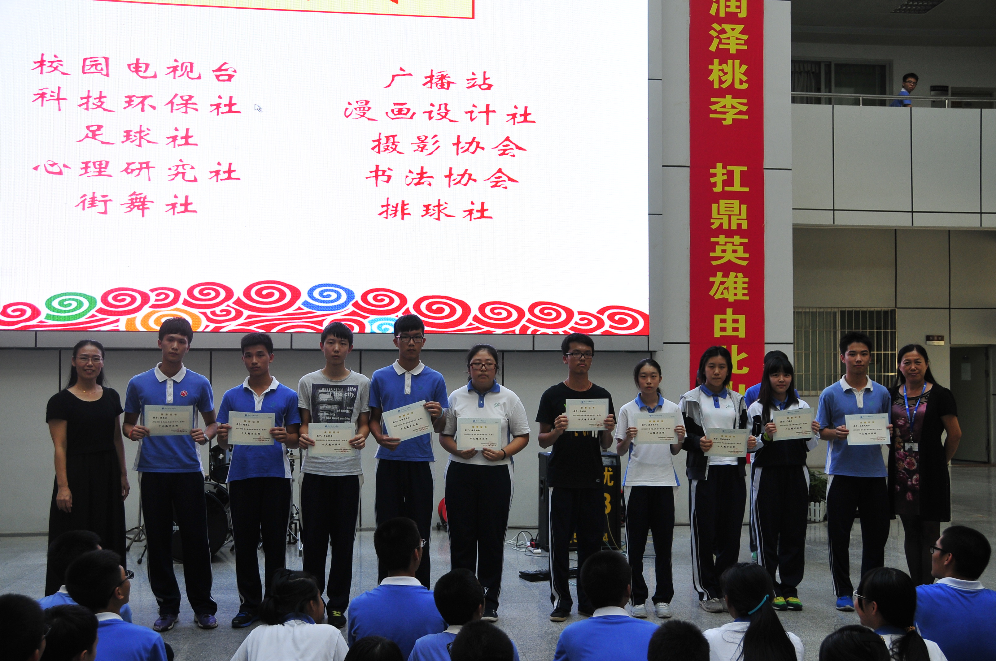 9月11日下午我校团委、学生社团联合会举行了学生社团表彰和招新大会。大会上团委书记李辉波老师宣读了表彰决定,表彰了上一学年的学生社团,为“十大魅力社团”、“十佳社团导师”、“十大社团领袖”、“百佳社团之星”颁发了奖项。