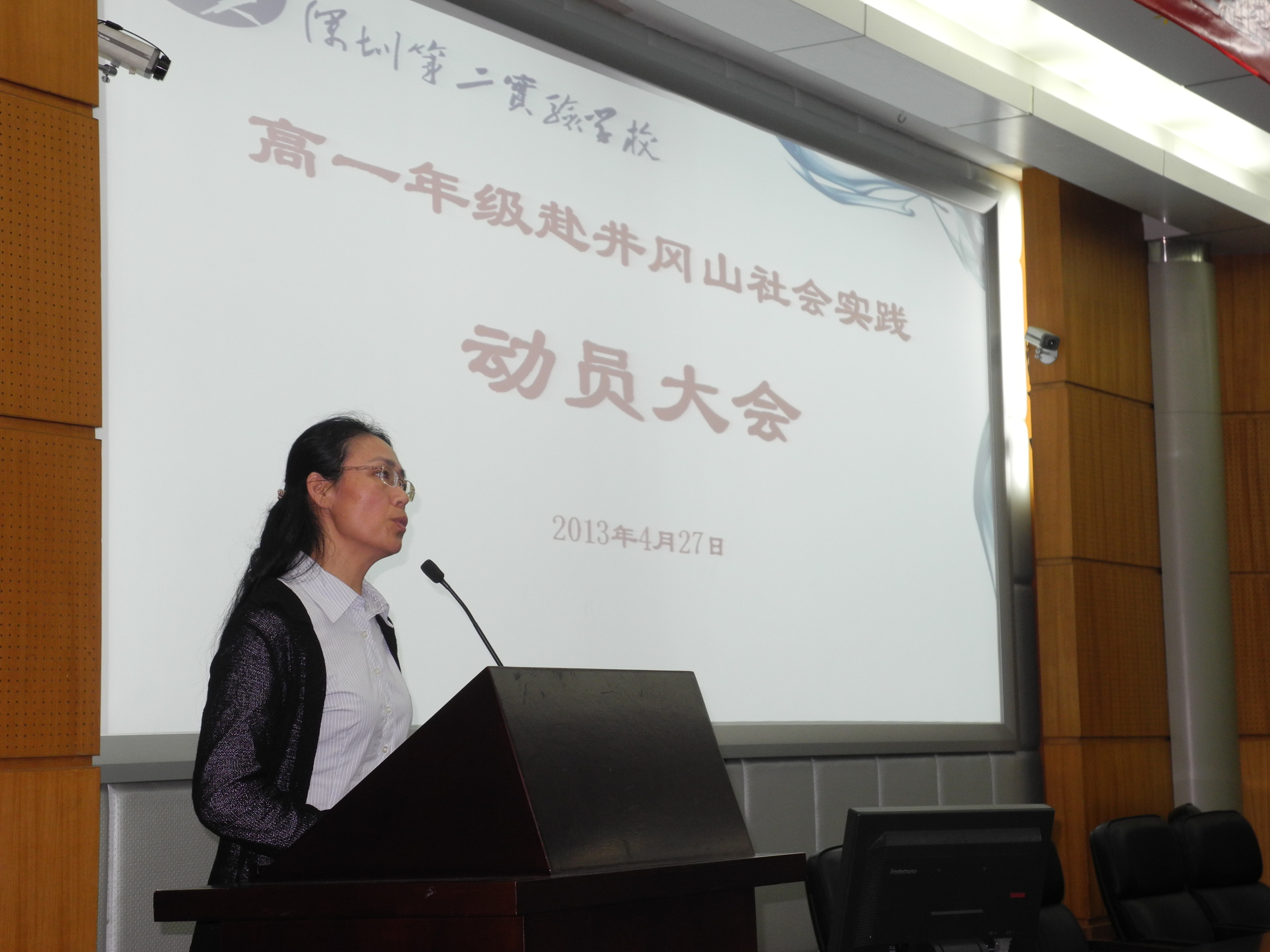 李雅萍副校长强调了这次社会实践活动的意义以及学校、年级和老师们组织这次活动的巨大压力,以及井冈山黄坳中学对我校学生的深情厚谊,希望同学们在这次实践活动中能够展现深圳中学生的良好素质以及二实学子的优秀风采。最后李校长重申了本次社会实践活动的纪律与安全要求。