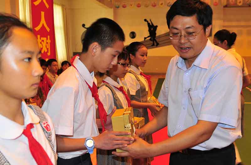 首先 ,年级主任左明云在会上讲话,鼓励同学们志存高远、奋发图强,做一名品学兼优的优秀学子,初中部学生会主席陈碧洲同学也对学弟学妹们提出了几点建议。接着主持人介绍了各班班主任老师,赵校长、郑校长为初一年级班主任颁发聘书,何校长、李校长为初一年级主任、班主任老师送鲜花。紧接着,赵校长为初一年级学生代表颁发具有年级文化特色的级标,为初一年级授旗,左主任代表年级接旗。