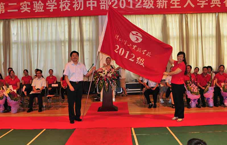 2012年9月2日,深圳第二实验学校初中部2012级新生入学典礼在文体馆三楼如期举行,初一全体师生精神抖擞的齐聚典礼现场。入学典礼由韦茜老师主持,赵立校长、郑联采副校长、何世盛副校长、各处室主任齐聚典礼现场。