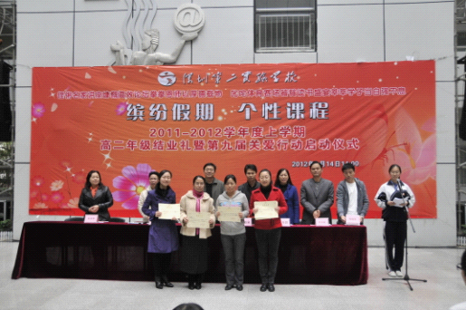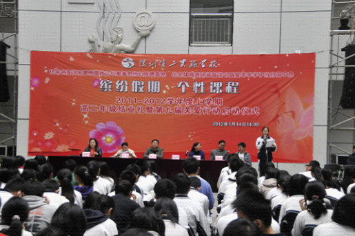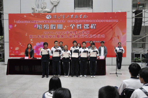 “铿锵名家讲座慷慨高效论坛拳拳恩师以厚德载物,叱咤体育赛场饕餮读书盛宴莘莘学子当自强不息。” 1月14日下午,教学楼架空层鲜红的标语格外醒目,高二年级在这里隆重举行2011-2012学年度上学期结业礼暨第九届关爱行动启动仪式。