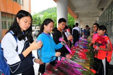 心手相携,爱在花香中传递,情在行动中扩散。义卖活动非常顺利,学生老师们都非常支持本次鲜花义卖,鲜花几乎在短时间内一抢而空。此次鲜花义卖共有40多名义工参加,总共义卖了3000支母亲节鲜花,文学社的《实光》杂志、社联的纪念手环、志愿者社团手绘手袋等也在此次活动中进行了义卖,初高中两部共筹集善款约5000余元,这些善款都将作为我校“献爱井冈山”公益项目基金,支持井冈山革命老区的教育和卫生事业。