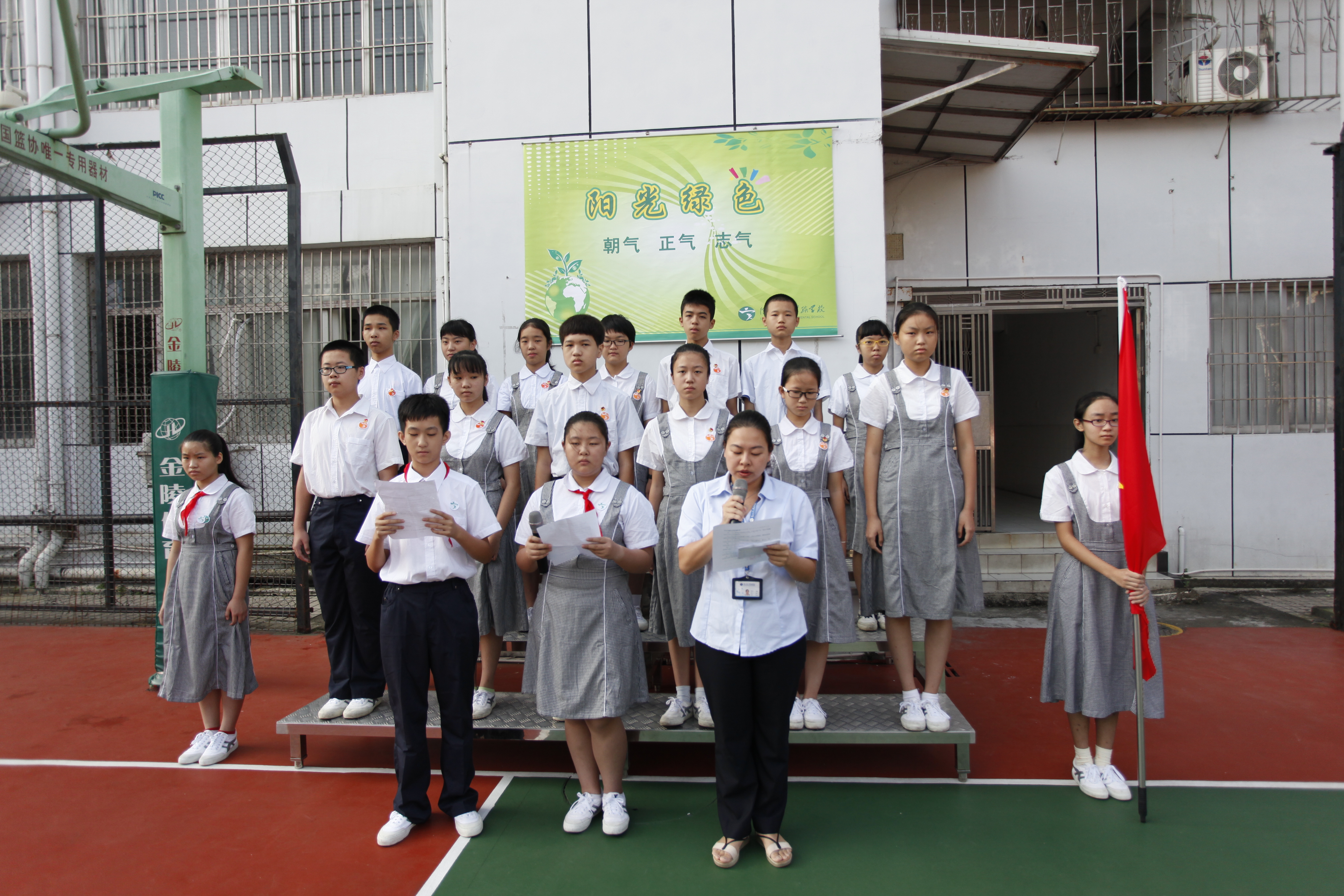 9月22日上午,初一年级全体师生在初中部操场举行第一次年级集会,本次集会由同学主持。本次年级集会一共有四个议程:初一年级少先队建队活动;总结开学三周各班常规情况;宣读初一年级学生会分会名单并颁发聘书:初一(1)、(2)班同学向全年级发出养成好习惯的倡议。
