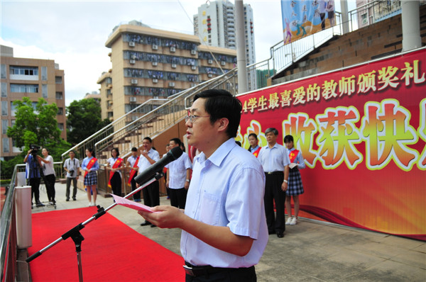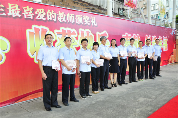 仪式第二项是为“2014年学生最喜爱的教师”颁奖。第二实验学校之所以能够实现跨越式发展,创造了一个又一个教育奇迹,正是因为有一批特别能战斗,特别能吃苦,特别能奉献的教师团队,是他们用自己的双手托起了二实的明天。为了加强师德师风建设,努力建设一支专业化程度高、服务意识强、职业幸福感足的教师队伍。我校在2014年6月—7月继续开展了“学生最喜爱的教师”评选活动,经过全体同学公平、公开、公正的投票,熊安义、朱池平、涂星火、林庆茹、徐岩、郭云奎、杨小林、邓书、张松群、羊巨波这十位老师当选“学生最喜爱的教师”。在颁奖的过程中,学生们掌声雷鸣、激情澎湃,这正是收获学生的尊敬与喜爱,是老师最幸福的时刻。这也正验证了“爱心,收获快乐;奉献,创造幸福”。