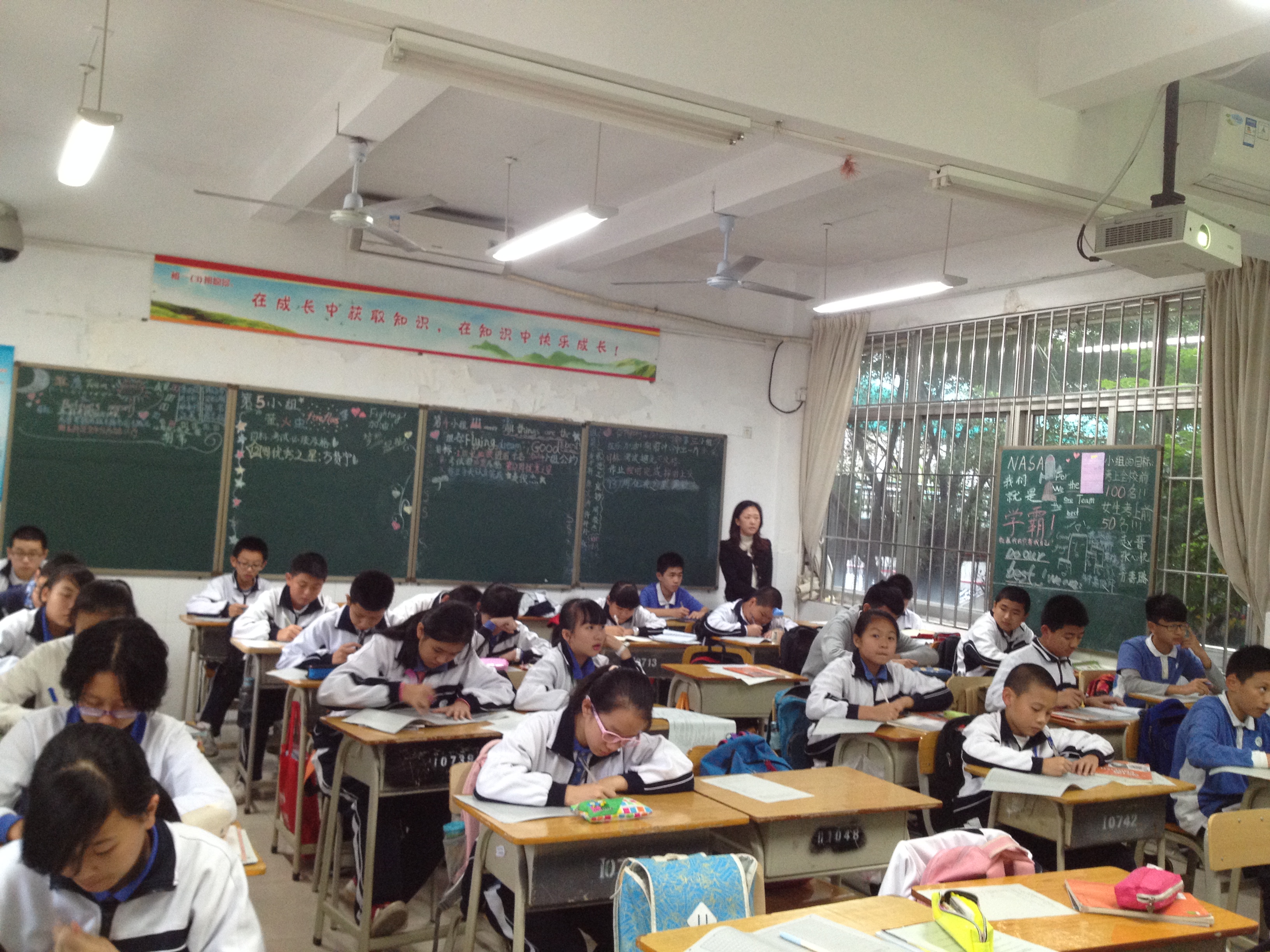 12月3日第九节课,初一年级各个教室大屏幕上展示着我们的校园像一首乐曲,像一座花园,像一枚宝石,像一罐蜜糖,像一缕阳光。 同学们,在我们的校园里,你的班级、同学、老师,你所学习的科目;你参加的活动或许校园里的一处景物一定有让你欢喜心动的时候吧。请以:《我真喜欢——》为题写作 要求:将题目补充完整,可 以填写某一个科目、老师、班级、活动、校园一景等;字数不少于600字。全体初一学生奋笔疾书,抒发着他们对学校、班级和老师等的真情。
