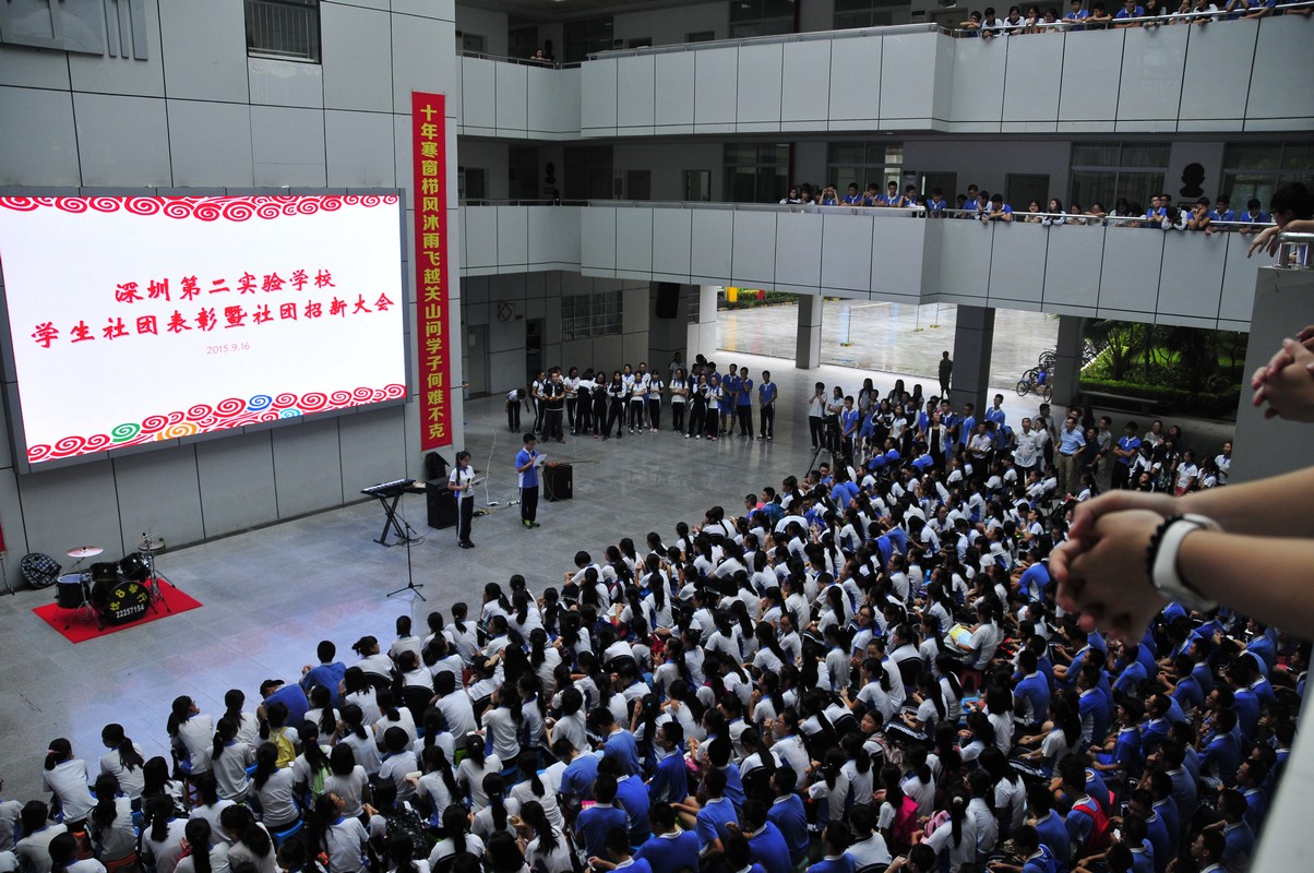在跆拳道社团、电声乐社团、街舞社团等获奖社团为全校师生带来了精彩的社团展示之后,新一届高一的同学们,纷纷簇拥到各个社团的招新的摊位前,了解不同社团组织和功能,选择自己心仪的社团。与往届招新大会不同的是,在今年的招新大会现场,LED电子屏幕上滚动播放着由团委、学生会、社团联的干部集体创作改编的《二实新社团》社团介绍歌曲,据学生干部们介绍,这是将全校的学生社团写进歌词,再以歌曲演唱的表现方式来向全校师生介绍我们丰富多彩的学生社团。